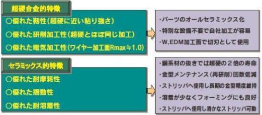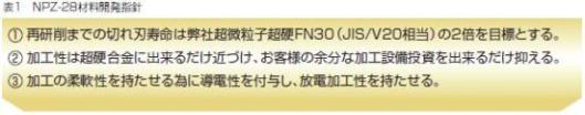「NPZ-28」をお取扱いいただく上で、貴社の金型生産の特徴によっては超硬合金よりは多少お取扱いに工夫が必要な場合もございますが、是非とも貴社の金型パーツとして使いこなして頂き、「金型メンテナンスサイクルの向上」と「パーツライフの向上」を実現頂き、プレス金型生産のコストリダクションを達成頂ければ幸いと存じます。