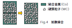 拡散接合とは、接触した超硬合金どうしを加熱することにより、各々の合金に含まれるバインダーが互いに相手材に浸透(拡散)し、その接合部分は、一体物と同じ様になる接合のことを言います(Fig.4参照)。当社では、この拡散接合技術を応用することにより、27×10(mm2)の断面で最長5mもの長尺製品の製作が可能です。
