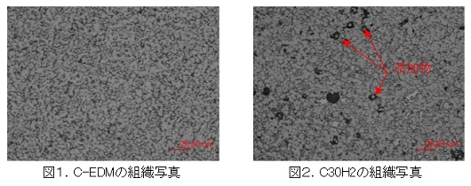 C-EDM は、銅タングステンに仕事関数の低い材料を微量添加しています。添加材を含むC-EDM、C30H2 の組織写真を図1、2に示します。この組織写真より、C30H2 は添加物の点在状況が確認されますが、C-EDM は添加物が確認されないほど均一に分散していることが分かります。この添加物が均一分散していることで電極全面から電子が放射(放電)され、均一にワークを除去(加工)することができ、加工後のワーク面粗さが良好になります。また添加物を均一分散したことにより、更に加工速度が速くなります。