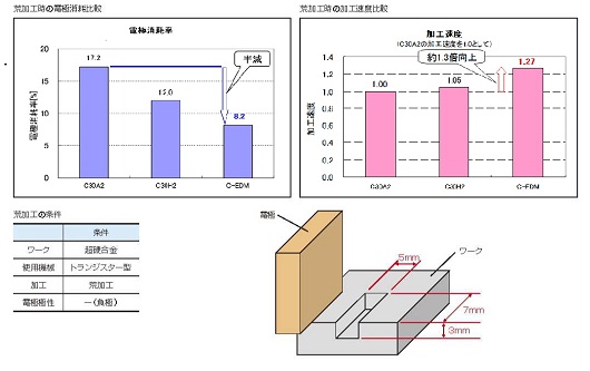 C-EDM の電極消耗率はC30A2 に比べ50%低減、C30H2 に比べ30%低減しています。