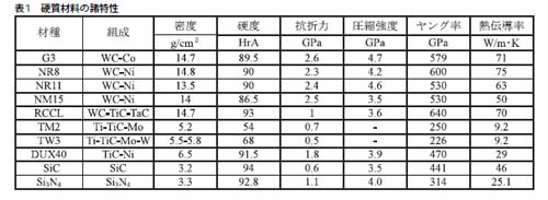 表1、図1には摺動材料として用いられる超硬合金の機械的特性、特徴を示している。