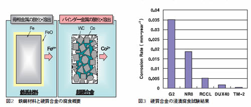 腐食の形態として、鉄鋼材料が大気中の酸素や水と反応して表面に酸化物、水酸化物の反応生成物(赤褐色の錆)を生じるのに対して、超硬合金の腐食は、CoやNiの結合相金属が優先的に溶液中に溶けだしていくような腐食形態をとるので、表面に腐食生成物を生じず、一見腐食しているようには観察されないが、内部の結合相金属の溶出により大きく強度低下を起こし、安定した摺動特性が得られないことが生じる(図2)。一般にNi結合相超硬合金が耐食性超硬と呼ばれ、さらにCrを添加した合金が強固な不働態皮膜を形成し優れた耐食性を示す、また炭化物粒度(WC粒径)が小さいほど耐食性に優れる。