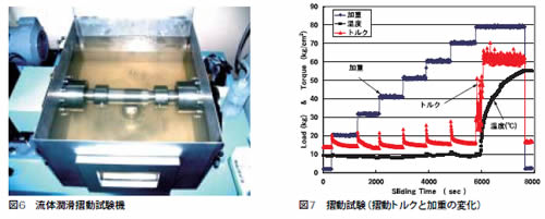 図6にはポンプ軸受けを模擬した流体潤滑摺動試験機を示している。図7には摺動によって生じるトルクの加重による変化を示しているが、摺動条件(PV値:摺動速度×加重)による潤滑状態(摩擦係数)が把握でき、限界PV値等の摺動特性が評価できる。