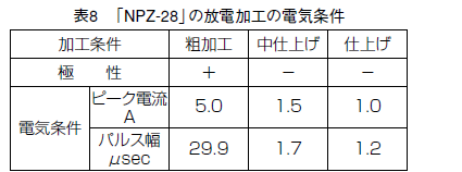8)「NPZ-28」の放電加工においては、本稿で示した放電加工の電気条件にて、3.1μmRzの面粗度を得ている。