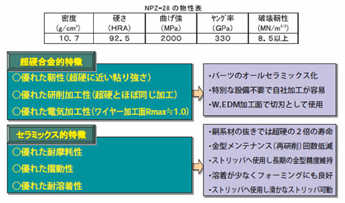 「NPZ-28」をお取扱い頂く上で、貴社の金型生産の特徴によっては超硬合金よりは多少お取扱いに工夫が必要な場合もございますが、是非とも貴社の金型パーツとして使いこなして頂き、「金型メンテナンスサイクルの向上」と「パーツライフの向上」を実現頂き、プレス金型生産のコストリダクションを達成頂ければ幸いと存じます。