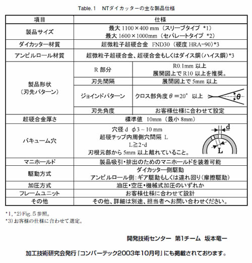 以上、超硬合金製ロータリーカッター「NTダイカッター」の特徴について述べさせていただきましたが、本製品の能力はまだまだ未知数です。開発以来サニタリー業界で成長を続け、ほぼ成熟した技術になりつつありますが、他の分野への展開についてはまだまだ草創期であります。現在もNTダイカッターに関する研究開発は積極的に行われており、加えて製造限界を拡大する加工技術開発もさかんに行われております。この機会に、超硬合金製ダイカッターもしくはロータリーカット方式にご興味を持っていただければ幸甚です。参考のため、NTダイカッターの主な製品仕様をTable.1に示します。