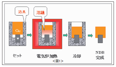 NDB法はタングステン(W)やモリブデン(Mo)に、銅を直接接合する方法として当社が開発したもので、Non Defective Bonding(無欠陥接合)の略称である。NDBの工法を図1に示すが、治具にW、MoまたはCu-W合金をセットし、Cu片を乗せ、非酸化雰囲気電気炉中でCuを溶解し、その後冷却してCuを凝固させ、シャンクを形成させる。