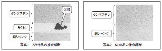 表1にろう付品とNDB品の接合部の品質比較を、写真1にろう付品の接合部断面を、写真2にNDB 品の接合部断面を示す。