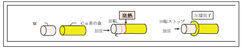 回転摩擦圧接法は、接合部に発生する摩擦熱を利用して圧接する方法で、Fe同士の接合として発展し、今では異種材質同士の接合にも広く用いられている。この摩擦圧接をWとCu系台金の接合に利用しており、その品質は先述のNDB法によるものと同等である。