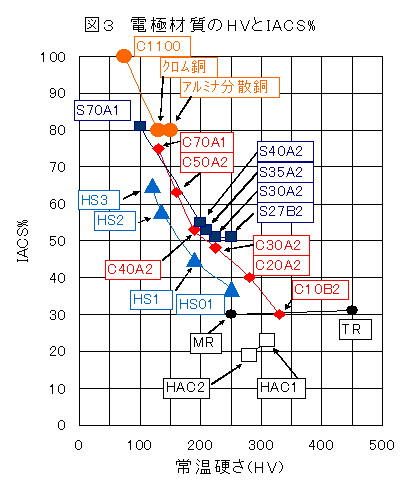 ただし、熱伝導率が低いことから、電極の発熱は比較的大きくなる。WやMoと合金化しやすいワーク材質やめっき皮膜であると、溶着、スパッタなどがひどくなる場合がある。