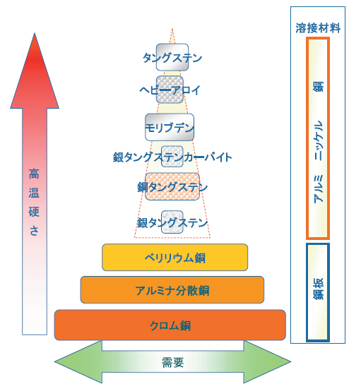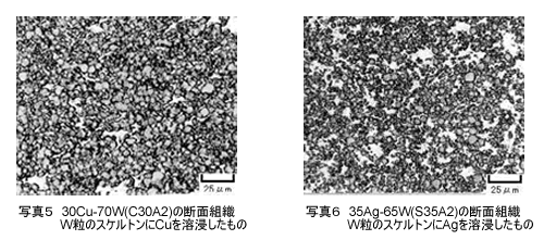 WとCu、Wと銀(Ag)を複合合金化させた銅タングステン合金(Cu-W)や銀タングステン合金(Ag-W)は、高温強度と電気伝導率を兼ね備えた