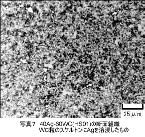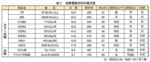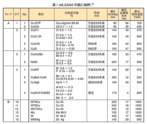 表1にJIS Z3234表2の抜粋を示しますが、これは国外規格であるISOに準拠しているため、Bグループに記載の25Cu-Wや23Cu-W合金組成は国内ではあまり流通していません。国内で市販されている標準組成は、30Cu-70W(当社商品名:エメ−C30A2 写真5)です。Ag-W合金の標準は35Ag-65W(同:エメ−S35A2 写真6)ですが、当社では10〜70Cu-残WのCu-W、20〜70Ag-残WのAg-Wをラインナップしており、溶接条件に応じた適切な材料を提供することができます。まず銅タンでは30Cu-70W(同:エメ−C30A2)、銀タンであればS35A2を供試いただき、その結果で前後の配合率のものを選定ください。